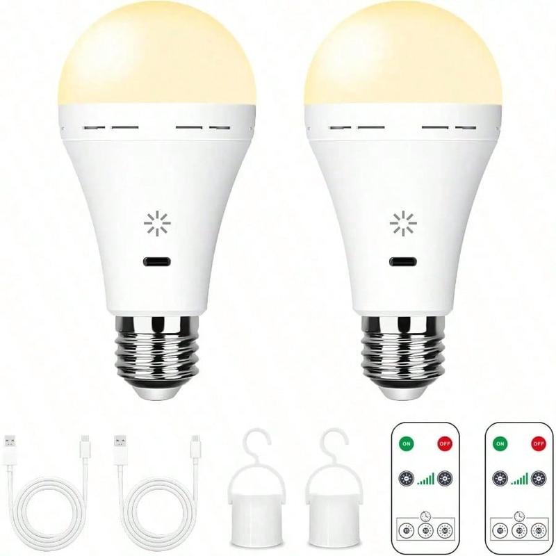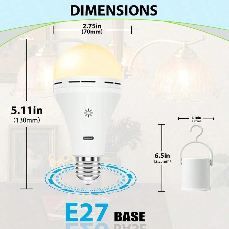 Description After conducting extensive market research, we found that many households are unable to install and use light fixtures due to the lack of pre-installed wiring on the walls, which greatly affects the living environment. Therefore, we have carefully designed and launched this USB-C rechargeable light bulb. This USB rechargeable light bulb is very lightweight, weighing only a few tens of grams, and can be easily carried for outdoor activities, travel, or mobile office use. It does not require a socket and can be charged through a USB interface. The charging time only takes 3-5 hours and can be used continuously for 8-10 hours, making it very convenient and effortless. Equipped with a remote control, the light switch, brightness, and timing functions can be easily controlled from a distance, making it very convenient and practical. In addition, it uses LED light source, 8W power design, and 800LM luminous flux, making it both energy-saving and bright enough. The lifespan can last tens of thousands of hours, which is far longer than traditional light bulbs. Notiz 1:Due to long-distance transportation, please charge the light bulb after receiving the package. It can be used when fully charged. 2:This product does not support fast charging protocol. Please do not use a fast charger to charge the light bulb. It is recommended to use a 5V/2A adapter. 3:The lamp head of this product is insulated and only powered by a battery. 4:Due to being powered by rechargeable batteries, the brightness of this light bulb may not be as high as that of a regular DC powered bulb. 5: LED bulbs are electronic products. If not used for a long time, the battery may deteriorate, affecting the life of the bulb or causing the bulb to not light. USB-C rechargeable light bulb: This light bulb can be charged through a USB-C interface, making it more convenient to use and an even more energy-efficient lighting product. In special situations such as camping, outdoor activities, or emergencies, it can also be used by connecting to a mobile power supply, making it very convenient. Equipped with remote control: Comes with a remote control that allows for easy control of the light switch, brightness, and timing functions from a distance, making it very practical and user-friendly. Lamp body touch: In addition to the remote control, there are also touch buttons on the lamp body, which can be used to adjust the brightness of the light to meet the needs of different scenes. E27/E26 socket compatibility: This light bulb is designed with a standard E27/E26 socket, making it compatible with most lamps and fixtures, and widely applicable. Designed with a hook: A hook is designed at the top of the light bulb, allowing it to be easily hung on cabinets, desks, and other places, saving space and making it more aesthetically pleasing. Timing function: This product also features a timing function, including three time settings of 15 minutes, 30 minutes, and 60 minutes, allowing you to rest or work without worrying about turning off the lights.