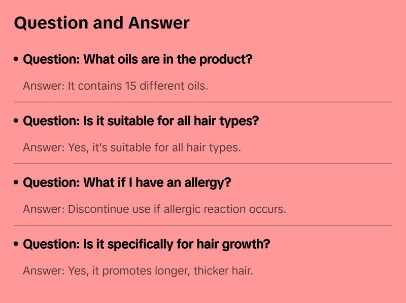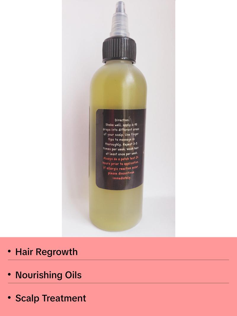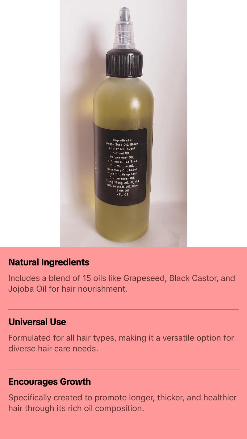 Growth Oil Ingredients: Grapeseed Oil, Black Castor Oil, Sweet almond Oil, Peppermint Oil, Vitamin E, Tea tree oil, Vanilla Oil, Rosemary Oil, Hemp Seed Oil, Cedarwood Oil, Lavender Oil, Ylang Ylang, Jojoba Oil, Avocado Oil, Rice bran Oil